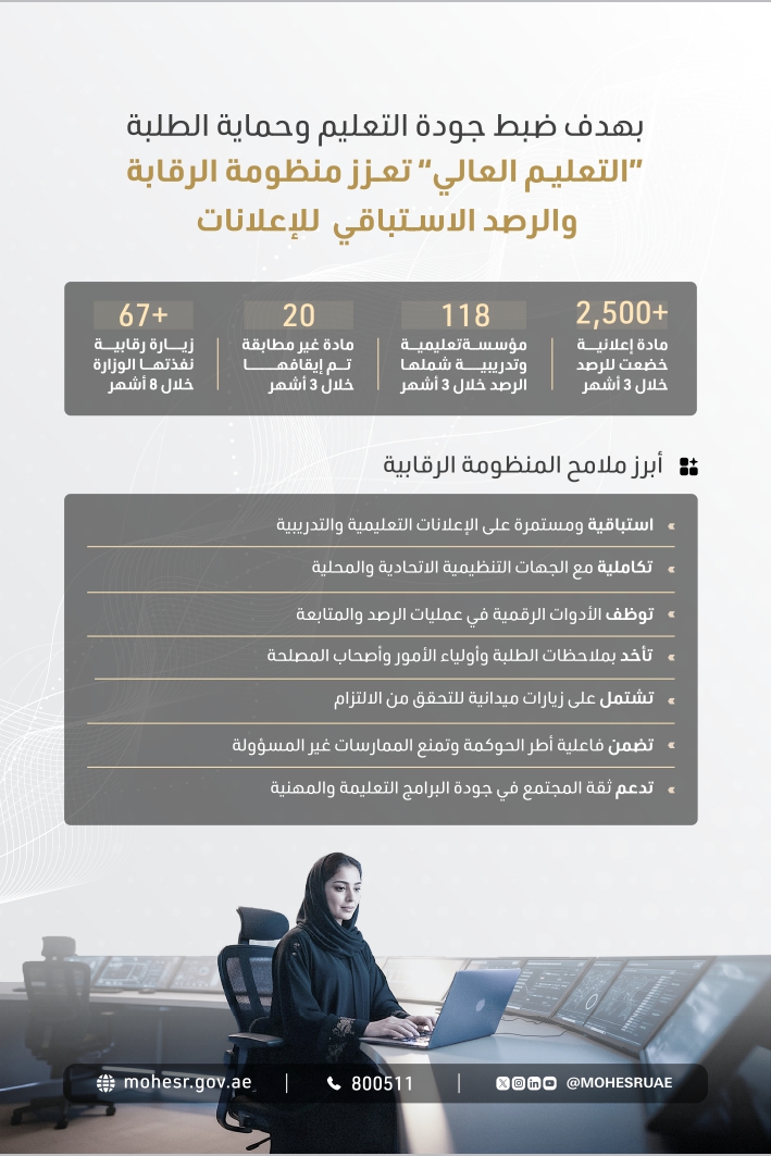 كشفت وزارة التعليم العالي والبحث العلمي عن متابعتها أكثر من 2,500 مادة إعلانية رقمية داخل الدولة صادرة عن 118 مؤسسة تعليمية وتدريبية خلال الفترة من يونيو إلى بداية سبتمبر 2025، وذلك من خلال منظومة الرصد الاستباقي التي تطبقها الوزارة والمعززة بتقنيات رقمية. يأتي ذلك في إطار جهود الوزارة المتواصلة لضمان جودة برامج التعليم العالي والمهني والتطبيقي وحماية الطلبة من أي ممارسات ترويجية غير مطابقة للمعايير.